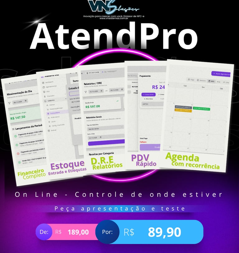O AtendPro é o sistema completo que seu negócio precisa: agenda inteligente com recorrência, PDV rápido, controle de estoque com geração de etiquetas, entrada de notas e financeiro robusto com DRE e relatórios gerenciais.